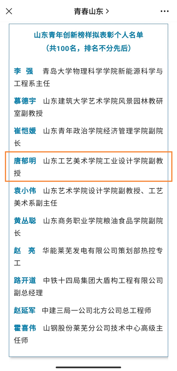 近日,由团省委、省青联开展的“山东青年创新榜样”推选结果揭晓。我校工业设计学院副教授、硕士生课程导师唐郁明获此殊荣。这是对青年教师立足专业领域,坚守一线、不懈攻关、辛勤付出、默默奉献的最好嘉奖。