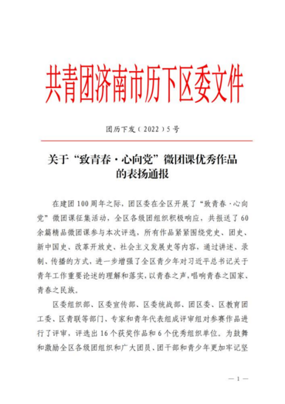 在共青团济南市历下区开展的“致青春·心向党”微团课征集活动中,我校喜获3项作品类荣誉,其中二等奖1项,最佳摄影奖2项,2025新澳门免费原料大全团委被评为“致青春·心向党”微团课优秀组织单位。