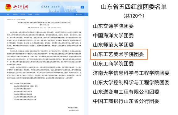 近日,共青团山东省委发布表彰决定,我校团委荣获2021年度“山东省五四红旗团委”荣誉称号。这项荣誉不仅是对我校共青团围绕“凝聚青年、服务大局、当好桥梁、从严治团”四维工作格局,团结带领广大团员青年听党话、跟党走工作成绩的高度肯定,也是对山工艺各级团组织和广大团员青年、团干部继续奋楫前行、再创佳绩的激励与鞭策。