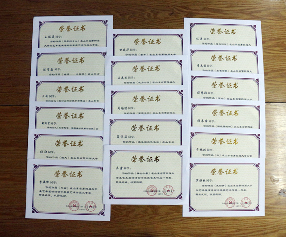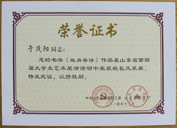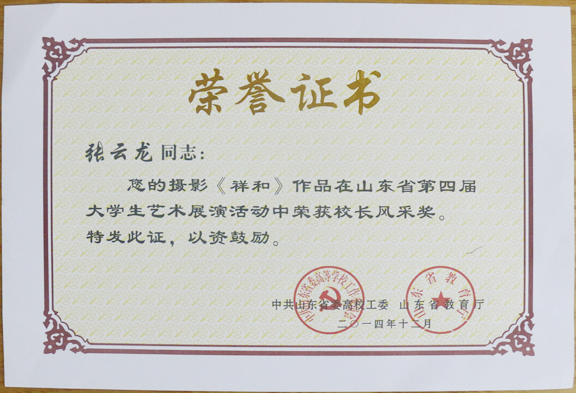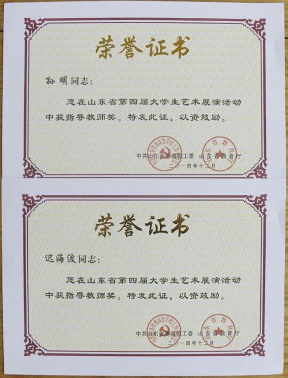 最终,党委书记于茂阳的书法作品《施肩吾诗》、原副院长张云龙(现为山东体育学院党委副书记)的摄影作品《祥和》荣获“校长风采奖”;迟海波教授、孙明老师荣获“指导老师奖”;学生作品获“艺术作品一等奖”和“艺术作品二等奖”各二项,“艺术作品三等奖”十项,“我和大艺展征文入围奖”一项,高校教育科研论文一等奖,三等奖各一项;报送的表演类节目《五月的花海2》与《跳弦》分别荣获艺术表演类节目二等奖、三等奖,《活着》、《盼》等四项艺术作品荣获山东省第四届大学生艺术展演活动“艺术作品类节目三等奖”。