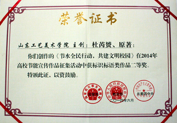 在此次活动中,我校团委积极发动在校大学生参加,最终由视觉传达设计学院张培源任指导老师的视觉传达设计学院学生杜芮赟、原著的作品《节水全民行动,共建文明校园》、杨佩设计的《节约从我做起》,创意新颖、内容丰富,深刻地体现了活动主题,以较强的视觉冲击力传递了厉行节约的青春正能量,分别取得了标识标语类二等奖、平面设计类三等奖的优异成绩。数字艺术与传媒学院DNA工作室的《迷鲸》,获视频类优秀奖。