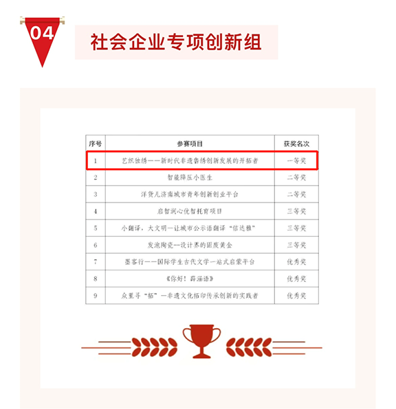 7月9日,第十届“创青春”中国青年创新创业大赛山东赛区暨“青创齐鲁”第十二届山东青年创新创业大赛在临沂开幕,科技创新和社会企业专项的决赛同日进行。我校造型艺术学院《艺织独绣——新时代非遗鲁绣创新发展的开拓者》脱颖而出荣获社会企业专项创新组一等奖。