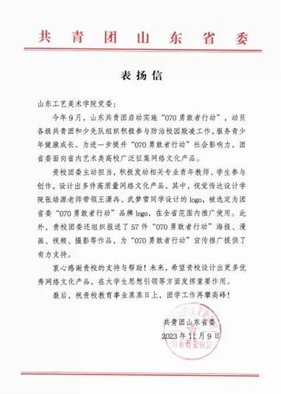 为此,共青团山东省委特意致函感谢,肯定了学校发挥专业特长,为人民而设计的服务理念以及在大学生思想引领等方面发挥的重要作用,同时也祝愿我校教育事业蒸蒸日上,团学工作再攀高峰。