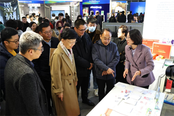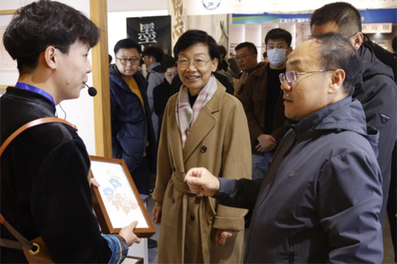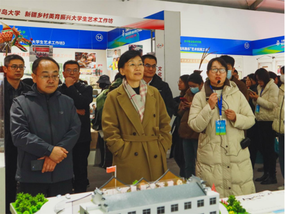孙晓筠、董占军与来自14所高校的15个艺术实践工作坊师生一一交流,了解各个工作坊布展及运行情况,场内观展人数众多,气氛热烈。来宾一行还参观了学生艺术作品展、郭志光美术馆及寄情大湾区作品展。