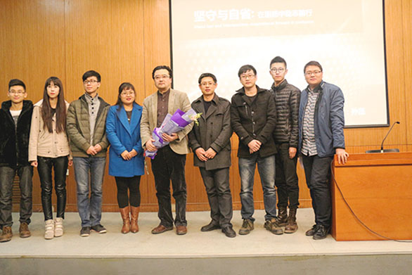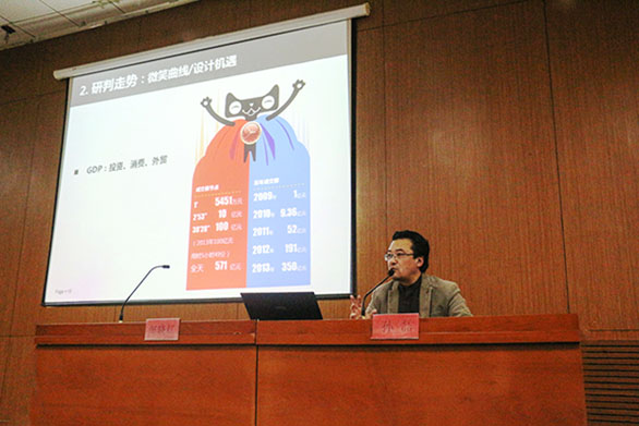 孙磊以“坚守与自省——在困惑中励志前行”为题,为来自各二级学院的学生从认清形势、研判走势、调整颓势、发展优势四个方面做了讲解,为同学们在专业、社会、未来发展等方面所存在的困惑做了细致的分析与指导。孙磊把设计专业放置在国际文化与经济的大背景下,并且贯通古今,结合当前个性化、多元化的消费趋势为大家指明专业的发展方向。孙磊分析了当今国际经济政治格局,他指出当前是一个尴尬的临界点,面对经济全球化、冷战思维以及以美国为首的西方国家的文化入侵,传统道德满目疮痍,本源文化遭到了严重破坏。因此,构建文化自信显得尤为重要。