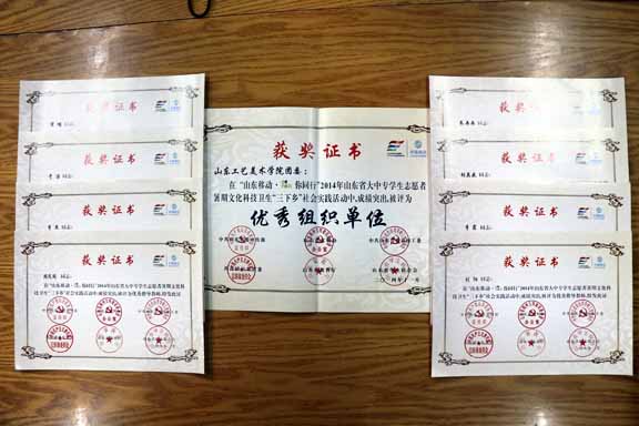 近日,团省委下发《关于表彰2014年山东省大中专学生志愿者暑期“三下乡”社会实践活动先进集体和先进个人的决定》的文件。我校在2014年全省大中专学生志愿者暑期“三下乡”社会实践活动中被评为“优秀组织单位”,刘阳等8位老师被评为“优秀指导教师”,李颖泽等15人被评为“优秀学生”,我校“乡村记忆工程”古村落实践调研小分队等7支小分队荣获“优秀服务队”。