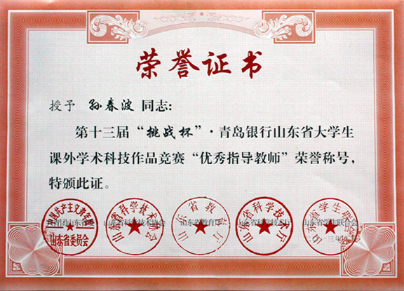 近日,收到共青团山东省委、山东省科学技术协会、山东省教育厅、山东省科学技术厅、山东省学生联合会联合下发的《关于表彰第十三届“挑战杯”·青岛银行山东省大学生课外学术科技作品竞赛先进单位、优秀指导教师和获奖作品的决定》。在此次竞赛中,我校孙春波荣获“优秀指导教师”的荣誉称号,并有三项学生作品分别荣获二等奖和三等奖。