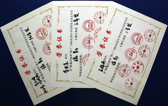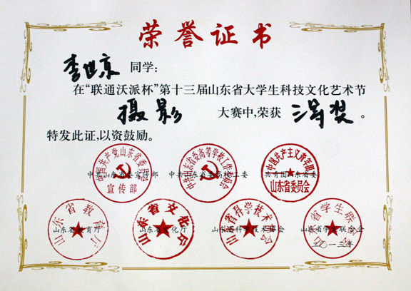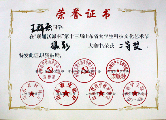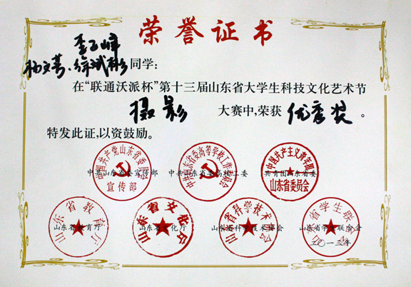 本次大赛由中共山东省委宣传部、中共山东省委高校工委、共青团山东省委、山东省教育厅、山东省文化厅、山东省科学技术协会、山东省学生联合会共同主办,最终王群燕同学荣获大赛的二等奖;李世京同学荣获三等奖;杨文芳、李子峰、徐斌彬同学荣获优秀奖。