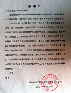 8月26日晚21时,烟台市牟平区兴苑纸业有限责任公司的厂房堆放的煤炭突然起火,火势迅速蔓延,我校学生徐世明、于彦圣和潘业兴三位同学及时发现了火情,事发时间较晚,该企业所有员工都已经下班离开,三名同学第一时间联系到企业负责人,并根据造纸厂周围的环境,冷静分析火势,奋力救火。在持续了两个多小时的奋力救火后,几位实习生和中途赶来的工作人员齐心协力将大火扑灭,帮公司挽回了数十万元的损失,厂房中的材料大多数被完整保存下来。他们的见义勇为的事迹给当地企业领导和员工心中留下深刻的印象。实习工作结束,烟台市牟平区兴苑纸业有限责任公司为感谢几位同学的见义勇为事迹向学校团委发来了表扬信和感谢信。