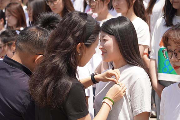 接下来,主持人宣布了新团员名单,各学院团总支书记为新发展团员佩戴了团徽。熠熠生辉的团徽,承载着共青团的光荣与责任,新团员们接过这份荣耀,也接过了时代赋予的使命。