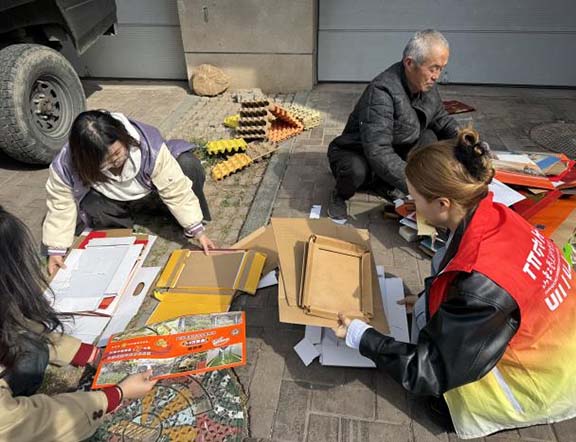 在清扫过程中,志愿者们注意到一位社区老人正为大量纸壳而发愁。了解到老人依靠回收纸壳补贴家用后,志愿者们迅速行动起来,分工协作,将散落的纸壳分类折叠、捆绑整齐。老人对志愿者们的帮助连连道谢,现场暖意融融。