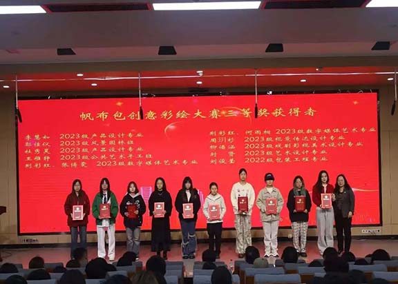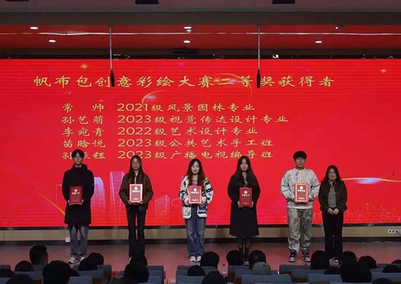 与会领导为帆布包创意彩绘大赛获奖学生颁奖。