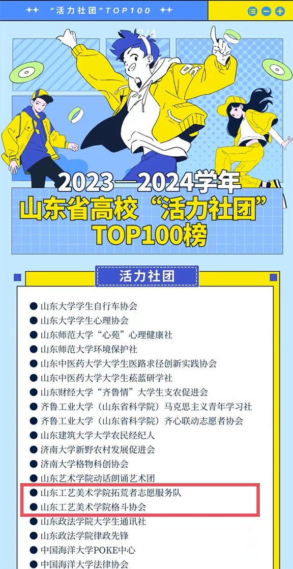 近日,在团山东省委学校部、山东省学生联合会开展的2023—2024学年高校“活力社团”风采展示活动中,我校拓荒者志愿服务队、格斗协会两个社团在众多高校学生社团中脱颖而出,入选TOP100榜。