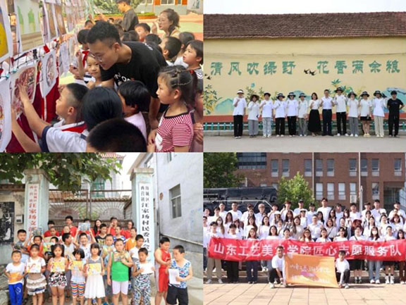 注重学生志愿服务精神的培育,尤其是注重引导学生以专业之所长践服务之精神,积极培育打造志愿服务品牌项目。自2010年开始,团委组织学生定期奔赴济南南部山区展长达10余年的美育支教,帮助乡村的孩子开设丰富多彩的第二课堂,开设了石头画、手工、衍纸、合唱等特色课程,让美育为乡村孩子赋能;志愿者们克服艰苦条件,潜移默化培养学生的奉献精神,期间累计共有1620余名志愿者参与,完成了8000余小时的授课,授课学生达5000多名。山工艺学子长期以来的志愿服务活动为南部山区的孩子带来的是源源不断的精神食粮。师生志愿服务寿光市营里镇美化乡村墙绘活动在2023央视五四晚会播出。2023年暑期,组织匠心志愿服务队近60名队员在沂南县、阳谷县等开展“青春手绘和美乡村”志愿服务项目,以“共创美丽乡村画卷”为主题的墙绘志愿服务活动,总计墙绘面积近3000平方,“匠心”志愿服务队被山东教育电视台报道。专业的志愿服务塑造了学生的责任感,传递山工艺美学子的温暖,让育人的工作充满着暖意,传递着温度。