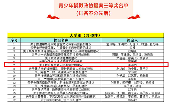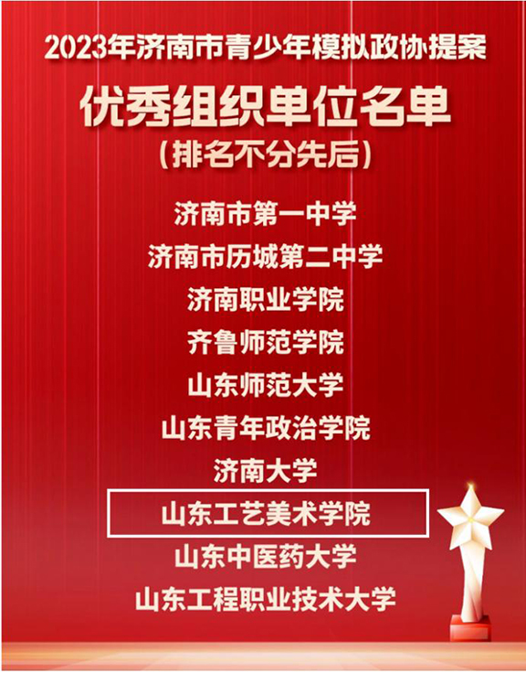 近日,由共青团济南市委、济南市政协办公厅、济南市教育局、济南市学联联合举办的2023年济南市青少年模拟政协提案征集活动圆满结束,获奖名单正式发布。其中由创新创业学院解恒言、杨景然两位老师指导的《关于改善乡村老人防暑意识欠缺问题的提案》荣获大学组三等奖,由人文艺术学院尉腾祥老师指导的《关于留守儿童暑期期间人身安全保护的提案》荣获大学组优秀奖。同时,我校荣获优秀组织单位称号。