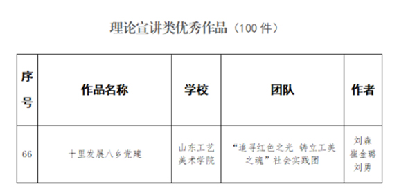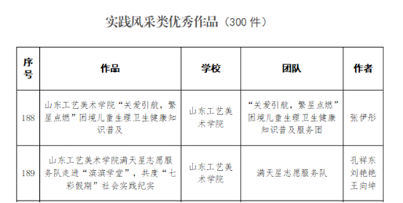 由数字艺术与传媒学院巩珂、程思远老师指导的“追寻红色之光 铸立工美之魂”社会实践团《十里发展八乡党建》获理论宣讲类优秀作品;由服装学院刘怡宏、王苏老师指导的“关爱引航,繁星点燃”困境儿童生理卫生健康知识普及服务团《“关爱引航,繁星点亮”困境儿童生理卫生健康知识普及》与数字艺术与传媒学院许凤豪、马克思主义学院杜子侨老师指导的满天星志愿服务队“七彩假期”志愿服务示范团《走进“滨滨学堂”,共度“七彩假期”社会实践纪实》被推选为实践风采类优秀作品。