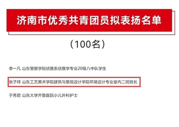 张子祥,男,中共预备党员,现任校学生会主席团成员,建筑与景观设计学院2020级室内二班班长,在校期间曾被评为优秀共青团干部、优秀共青团员、校级优秀学生、学生会优秀学生干部等等。学习认真刻苦,积极参加各类社会实践和志愿服务活动,曾获2020-2021学年综合二等奖学金,2021-2022学年综合一等奖学金、国家励志奖学金、山东省“三下乡”社会实践优秀学生、济南市“三下乡”社会实践优秀学生等。