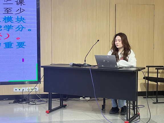 林小涵以“第二课堂成绩单”制度解读及“到梦空间”操作流程为主题,分别从“什么是第二课堂”、修订后的第二课堂分值表、“到梦空间”APP学生使用指南和常见问题解答等多方面进行了详细讲解,使各基层团干部充分了解了“第二课堂成绩单”制度以及“到梦空间”系统的操作。