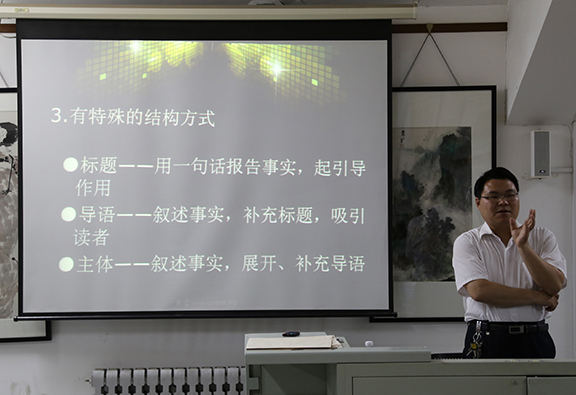 为提高学生新闻写作能力,规范新闻写作形式,5月29日晚,由团委在长清校区综合办公楼举办新闻写作专题培训,培训由山东中医药大学校报副社长崔国军老师担任主讲,团委组织宣传部副部长王军强主持。校学生会,各二级学院学生会负责新闻宣传负责人及团委《青年报》记者参加培训。 讲座伊始,王军强讲述了学校新闻宣传写作及上报的重要性,指出目前部分学院学生活动在宣传中存在的问题,并要求学生会严格按照学校新闻上传要求,按时、保质完成学生活动的宣传工作。崔国军分别围绕消息的概念、结构要素、分类、特征进行了讲解,消息就是要真实、简单明了、少用评论性话语、切不可夸张事实。崔国军对报纸编辑进行了解说,编辑流程主要分为:选稿、改稿、画版、校对,作为一名编辑最重要的是选稿、改稿、画版三部分,切不可出现题目错别字、语法错误、留白等硬伤。最后,就同学们提出的问题,崔国军进行了解答。