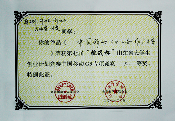 我校学生在第七届“挑战杯”山东省大学生创业计划竞赛中国移动G3专项竞赛中喜获佳绩 [附图]
