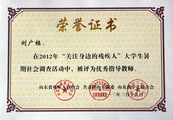 近日,由山东省残疾人联合会、共青团山东省委、山东省联合会共同主办的“关注身边的残疾人”大学生暑期社会调查活动评选结果落下帷幕。在此次活动中,我校获评优秀组织单位,刘广栋荣获“优秀指导教师”荣誉称号,并有多名学生获奖。