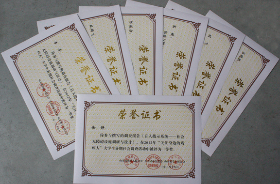 校团委组织学生积极参与其中,组成多个团队针对不同的课题进行调查。最终,吕晓凯、徐静、李芳、盛锦飞、陈薇亦、高媛、刘飞同学参与撰写的调查报告《盲人指示系统——社会无障碍设施调研与设计》,在2012年“关注身边的残疾人”大学生暑期社会调查活动中被评为一等奖,吴超撰写的《不断发展的残疾人保障制度》评为三等奖,此外有5份调研报告荣获优秀奖。