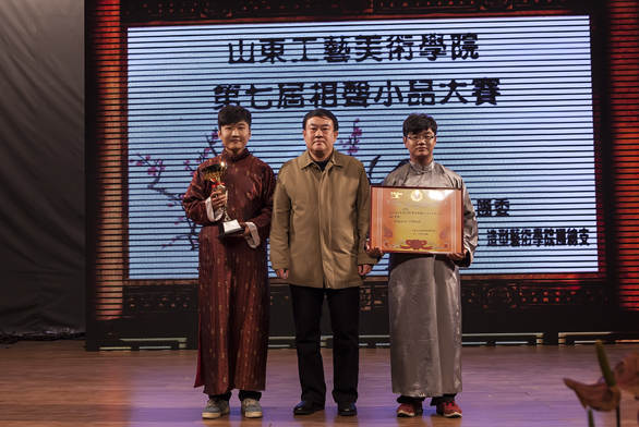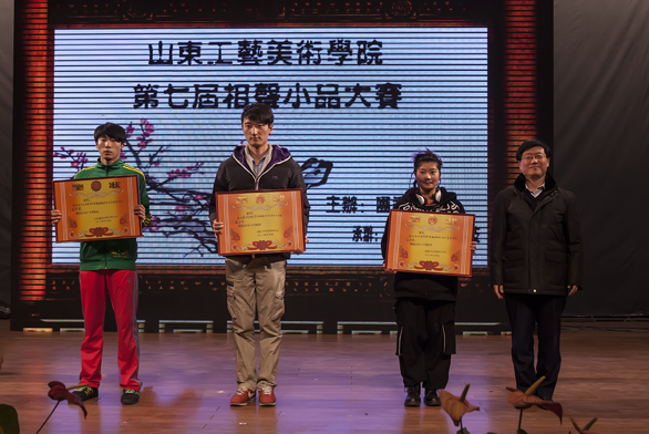 赛场上,演员们精湛的演技、滑稽的动作、丰富的表情、幽默的话语反映出大学生良好的精神面貌和综合素质,讴歌了学校四十年磨砺奋进、自强不息、捷报频传的发展历程,展现了作为一名工艺美院人的自豪和对母校的热爱。节目动情之时使人潸然泪下,幽默之处让人捧腹大笑,寓理之中引人瞑目深思,整场比赛高潮不断,掌声不绝,让同学们在轻松愉悦的氛围中受到了深刻的教育和熏陶。本次比赛除了参赛选手带来的节目外,还邀请到了造型艺术学院爱心支教点长清区万南小学的学生们带来的动感舞蹈《西域风情》及济南艺术学校的嘉宾带来的精彩相声《反正话》,进一步丰富了活动内容,活跃了会场气氛,博得了全场观众的阵阵掌声,第七届相声小品大赛在一片热烈祥和的氛围中结束。