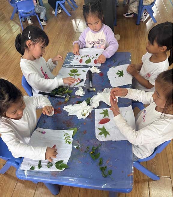 活动现场,志愿者们细心向小朋友们讲解制作方法和注意事项,将采集而来的各类植物巧妙地摆放在桌面上,并向小朋友们展示不同植物的独特纹理与色彩。在志愿者的引导下,小朋友们迫不及待地挑选自己喜爱的植物,将其排列在白色布料上。他们仔细观察每一片叶子和花瓣,讨论着它们的形状和颜色。志愿者们耐心地回答孩子们的问题,确保每个人都理解了制作过程。小朋友们在志愿者的帮助下,小心翼翼地将植物固定在布料上,准备开始敲打,整个过程充满了互动和欢笑,孩子们的脸上洋溢着好奇和兴奋的表情,期待着接下来的创作过程。