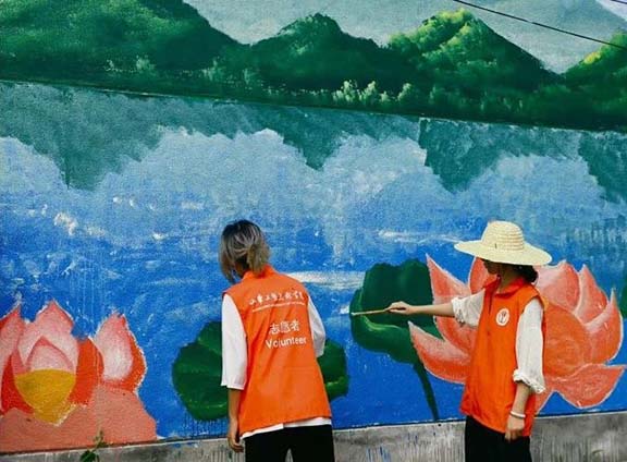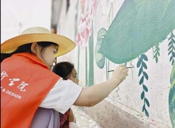 志愿者们化身“乡土画师”,走遍小杏花村的街巷角落,把斑驳墙面变成了承载村庄记忆与发展愿景的鲜活载体。志愿者紧扣村子的农耕底色与民俗风情,将金黄的麦田、忙碌的农民伯伯、硕果累累的果树融入画面,让乡土气息扑面而来;还加入“绿水青山就是金山银山”“新时代乡村风尚”等理念,用生动线条勾勒生态宜居的图景,用明快色彩传递文明新风。