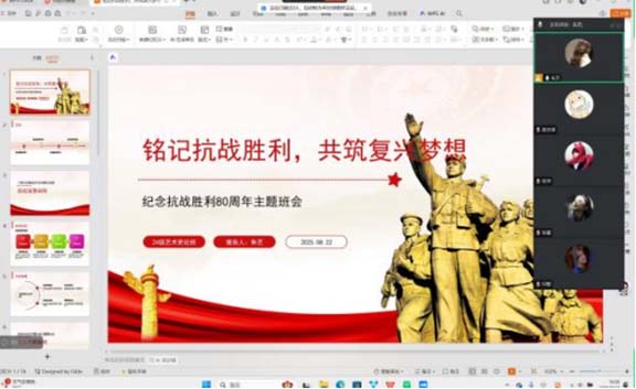 活动期间,各团支部组织开展“纪念抗战胜利80周年”主题班会,紧密围绕“伟大抗战精神”展开讨论。从家喻户晓的抗战故事到家乡的抗战英雄,同学们在讨论中回望那段峥嵘岁月,深入了解抗战时期的艰辛历程与伟大成就,感受中国人民在抗战中的坚韧不屈。同学们纷纷表示,将深刻领悟伟大抗战精神,铭记英雄历史事迹,用自己的力量将红色基因接续传承下去。
