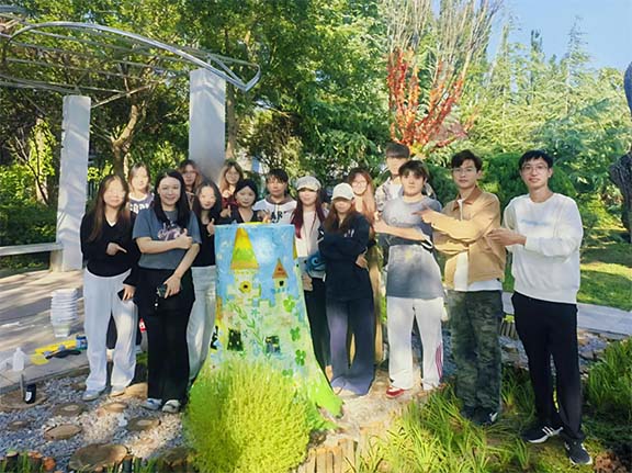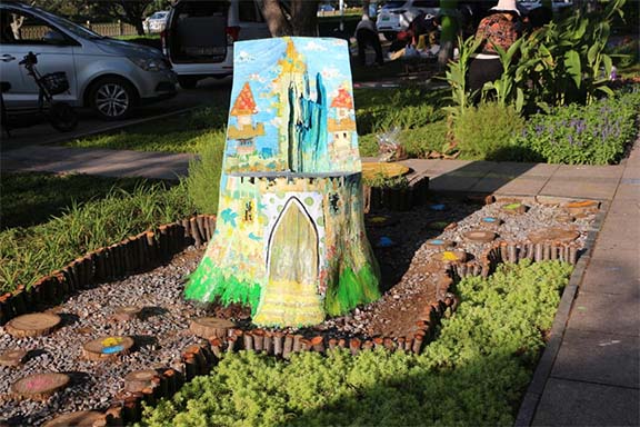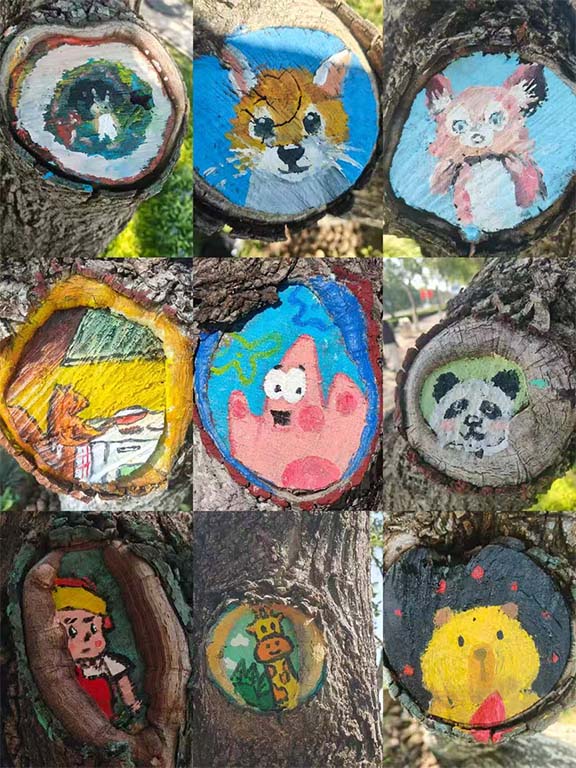 在树桩创作区,同学们巧妙利用树木年轮天然的纹理与岁月质感进行创作。有的将年轮转化为行星的轨道,描绘出浩瀚宇宙;有的将其化作动物的形态,充满灵性;还有的绘制出缤纷的花朵,寓意着“生命轮回,艺术永生”。原本略显沧桑的树桩,在色彩的妆点下焕发出全新的艺术生命力,成为一个个承载着梦想与故事的“大地艺术展品”。