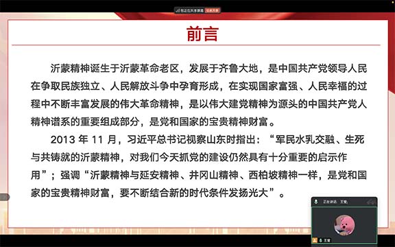 活动围绕传承什么、为何传承与如何传承三个方面逐步展开。通过回顾党的奋斗历程与习近平总书记关于弘扬沂蒙精神的重要指示,系统阐释了沂蒙精神的核心内涵与发展脉络。大家纷纷表示,要将沂蒙精神融入日常学习与生活,以实际行动提升弘扬精神的责任感与行动力。