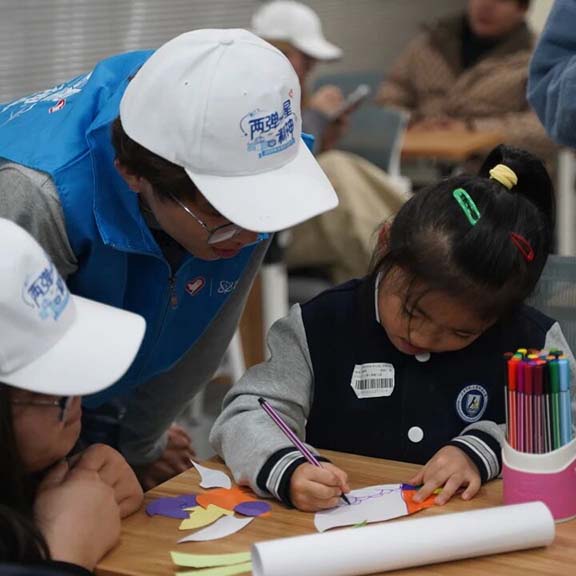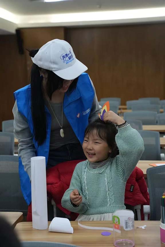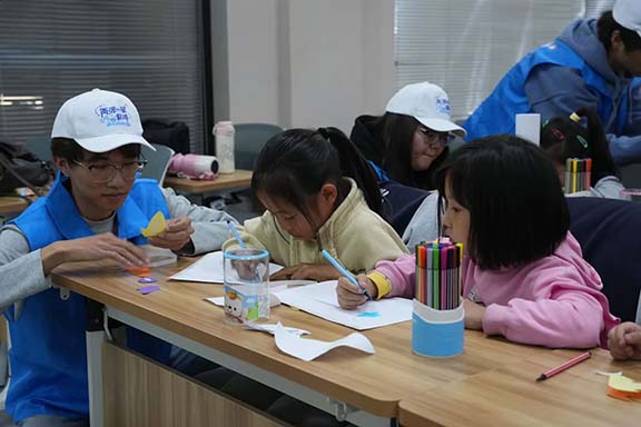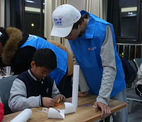 手工环节里,孩子们在志愿者指导下,用纸筒、卡纸等材料制作“我的小火箭”,在创意实践中寄托对航天科技与核工业发展的美好憧憬。