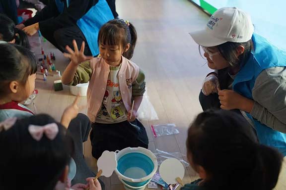 活动中,志愿者通过图文与动画讲解“碳达峰”“碳中和”知识,强调减排对地球环境保护的重要性。随后孩子们利用废弃奶茶杯盖和颜料动手制作“奶茶盖星球”,在创作中亲身体验“变废为宝”,深化对绿色低碳理念的理解。