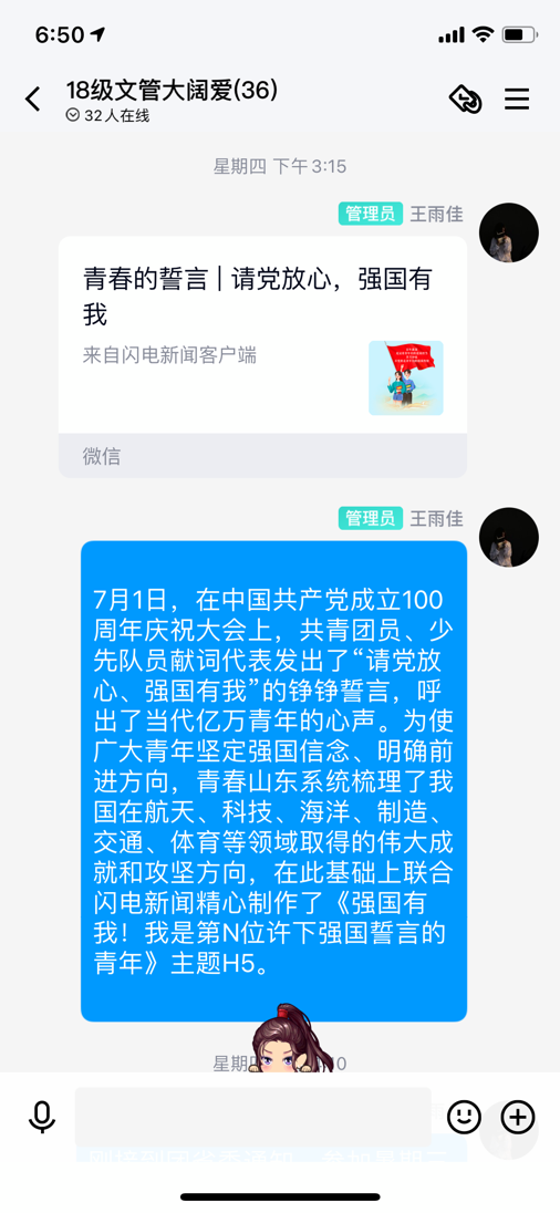 为使同学们坚定强国信念、明确前进方向,引导青年学生立志强国、投身报国,7月29日,人文艺术学院团总支举办了“请党放心,强国有我”的主题团日活动,各基层团支部积极响应,纷纷开展线上主题云团课。通过观看精心制作的H5动画,聆听深入浅出的讲解,分析两个百年目标的转变,以面向历史、现在和未来为跨度,贯通“四个伟大、三个方面”,人文学子对“请党放心,强国有我”这句话有了更为深刻的理解。