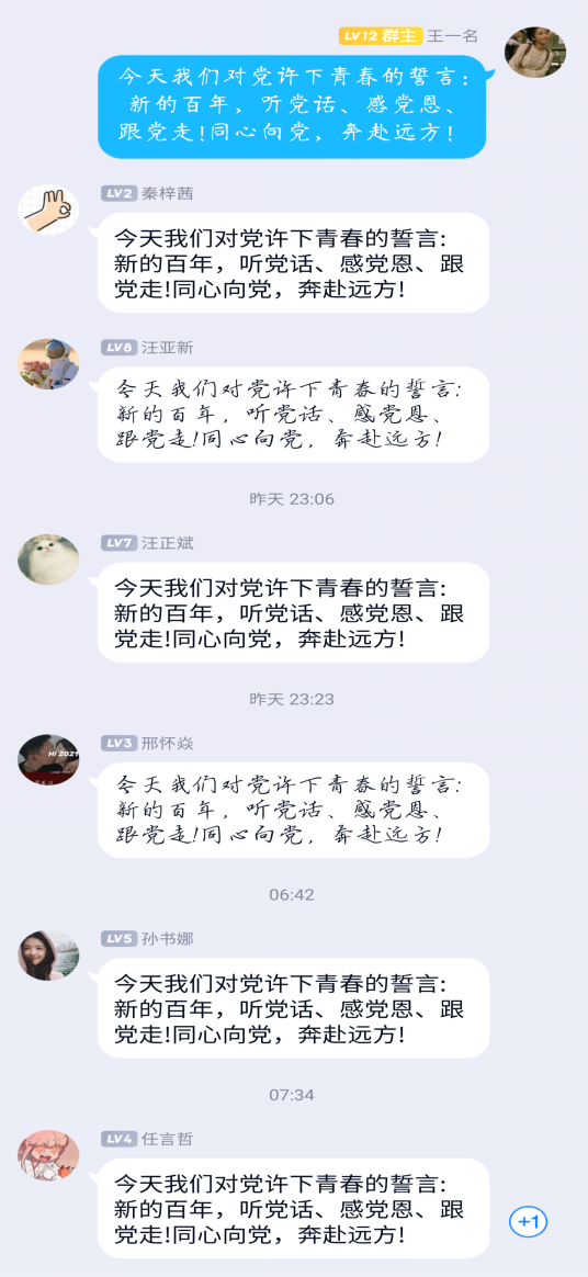 同学们明白,作为青年一代,要以七一为契机,忆苦思甜,铭记光辉历史,传承红色基因。把初心使命转化为锐意进取、开拓创新、埋头苦干、真抓实干的自觉行动。把自己的人生理想与祖国、时代、人类命运联系起来;树立远大的理想,培养良好品德,发扬创新精神,掌握实践能力;勤奋学习,立志成才,做个新世纪的社会主义事业建设者。