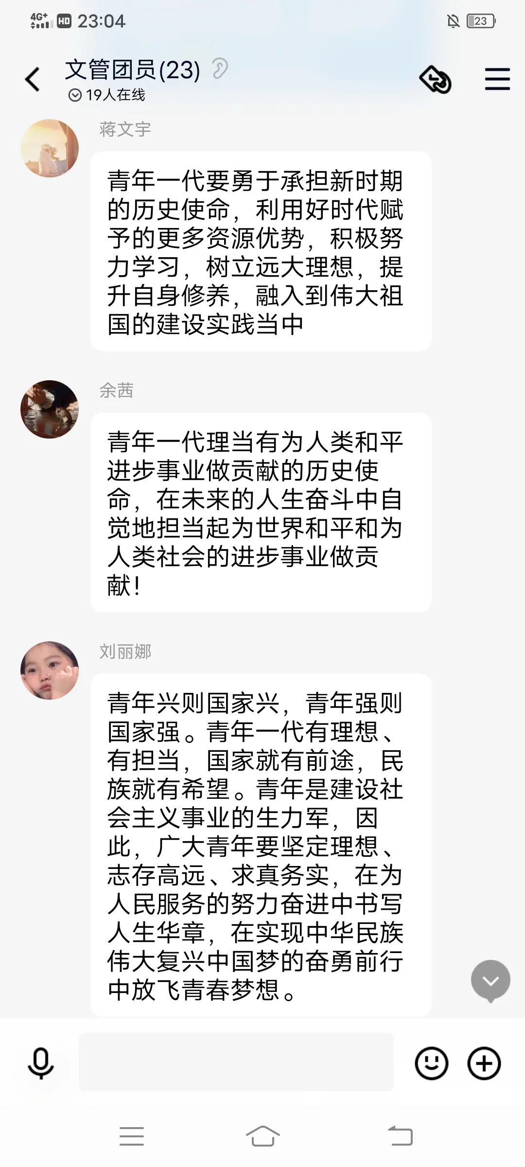 “未来属于青年,希望寄予青年。”习近平总书记特别强调,“新时代的中国青年要以实现中华民族伟大复兴为己任,增强做中国人的志气、骨气、底气,不负时代,不负韶华,不负党和人民的殷切期望”。大学生代表着国家的希望和民族的未来,新时代的年轻人,是有远大理想的一代,也一定是能够担当大任的一代。百年之前,风雨如晦的旧中国,正是一群觉醒的新青年,高举起思想的火炬。今天,风云激荡的新时代,21世纪的新青年,正信心满怀准备着接过时代的接力棒。“奋斗正青春,青春献给党。请党放心,强国有我!”这是亿万青少年的铮铮誓言,这是亿万青少年对党和人民的郑重承诺,这是亿万青少年对世界的庄严表白。