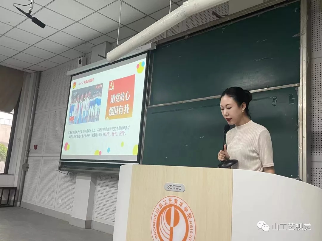 根据学校团委工作安排,2021年9月18日下午,视觉传达设计学院在长清校区综合楼第五合堂开展新学期“请党放心,强国有我”共青团第一课。本次团课面向学院2021级新生,由视觉传达设计学院团总支副书记陈瑶主讲。