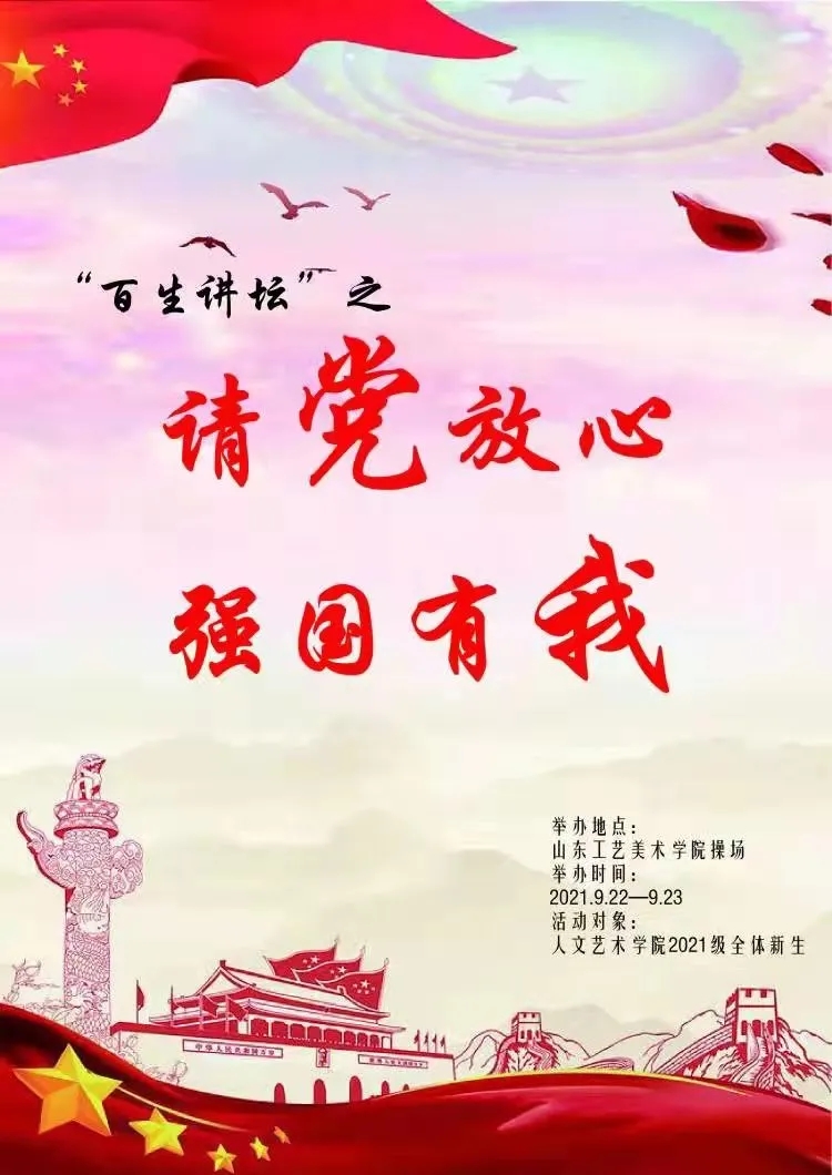 为深入学习贯彻习近平总书记在庆祝中国共产党成立100周年大会上的重要讲话精神,推动党史学习教育在青年学生中走深走实,教育引导广大团员青年了解党的光辉历史、感悟党的初心使命、领会党的创新理论、认知党的及精神谱系、传承党的红色基因、赓续党的红色血脉,引导青年学生努力成长为实现中华民族伟大复兴的先锋力量。人文艺术学院团总支积极响应校团委的号召,结合建党百年的时代背景,通过“百生讲坛”活动,以讲演的形式发出“请党放心,强国有我”的铿锵誓言,引导广大青年厚植爱党爱国的情感,进一步增强责任感和使命感,抒发青春情怀。