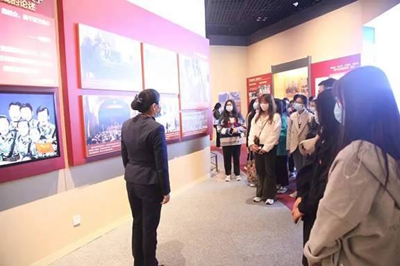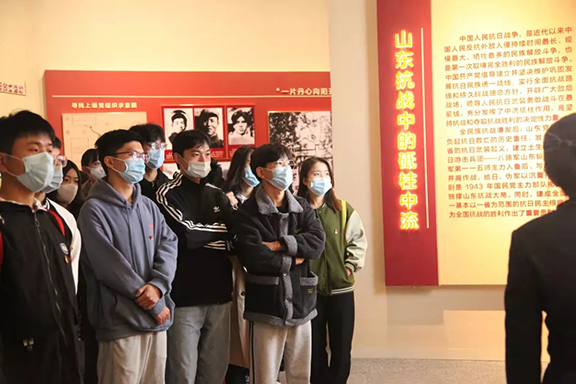 山东省博物馆“让党旗永远飘扬”庆祝中国共产党成立100周年的主题展览以时间为主线,分为四个展区进行展出。在“筚路蓝缕 苦难辉煌”展区中,大家看到山东党组织艰苦创业中必胜的决心;其中展出的民间孤本《共产党宣言》吸引大家驻足,红色火种深植心间。“艰辛探索 砥砺前行”展区中,山东党组织紧随党中央领导,积极探索、大胆实践;陈列有山东省人民政府升起的第一面国旗,其纪念意义之重大,在师生心中激荡钟磬般洪声。“勇立潮头 改革开放”展厅中,3D立体投影的黄河牌汽车,代表山东党组织带领山东人民走上康庄的开端,师生眼前,一幅党和人民共同奋斗的画卷已徐徐展开。