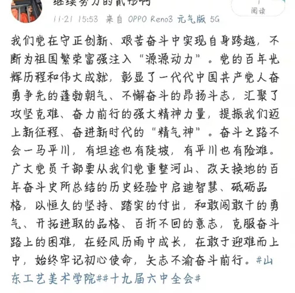2021年11月21日,为深入学习中国共产党第十九届六中全会重要讲话精神贯彻习近平总书记重要讲话精神,工业设计学院团总支委员会组织工业设计学院全体团员学习党的十九届六中全会精神,通过观看第十九届中央委员会第六次全体会议公报视频和发送微博的形式来进行学习心得交流。
