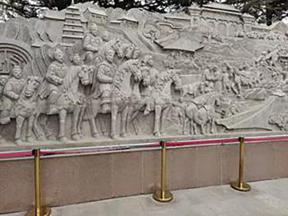 通过此次社会实践活动,让我充分了解了兰州金城的历史与文化。兰州得益于丝绸之路,成为重要的交通要道、商埠重镇。在广场两侧,分别矗立着两座大型汉白玉浮雕,一座是丝路古道、一座是唐蕃古道。浮雕正面栩栩如生的商旅团队、背面蜿蜒勾画的古道地图,不仅向人们展现出汉唐盛世曾经的雄风,还向人们诉说着古金城在国家历史发展中的辉煌历史。