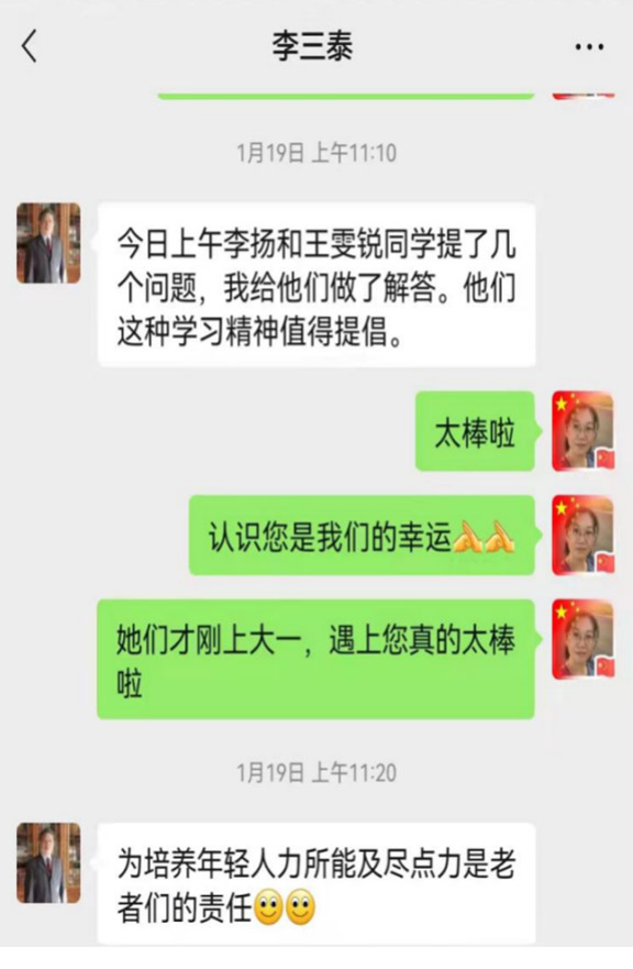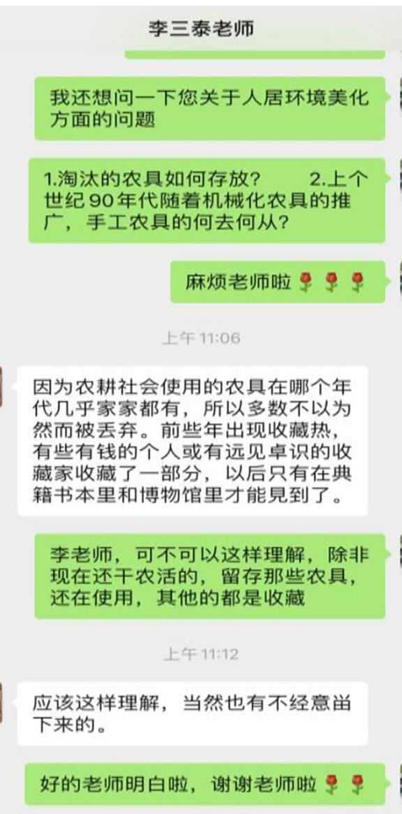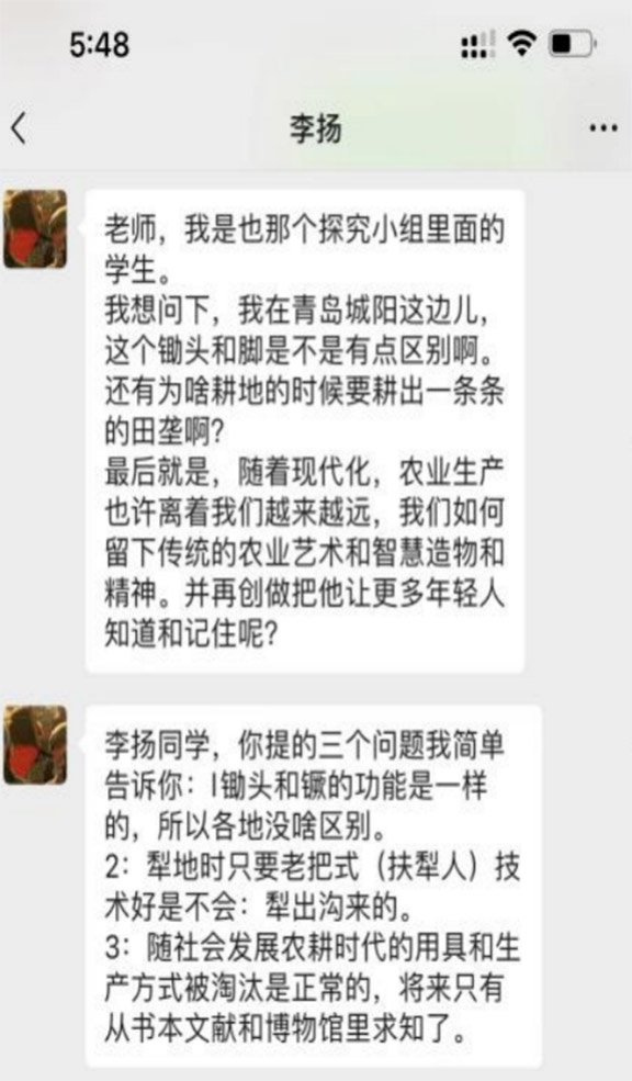 云采访之后,小组成员后续通过微信与李老师进行一对一的单独沟通:王雯锐和李扬同学就农村中随处被丢弃的传统农具、手工农具的存留问题以及锄头和镢的功能分别请教李老师;李博文同学就镰刀在农村继续使用的问题与李老师进行沟通,李老师对此做出详细解释:比如割韭菜、湾塘里面的芦苇,镰刀虽然不能大范围的普及使用在农业生产方面,但是他在生活方面短时间内是不会被取代的;张蕊同学与李老师讨论了“耦耕”的问题。