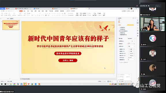 5月23日,视觉传达设计学院团总支副书记陈瑶面向上半年党员发展对象、入党积极分子,以“青年应有的样子”——学习“习近平总书记在庆祝中国共产主义青年团成立100周年大会上的重要讲话”精神为主题,开展线上专题宣讲。