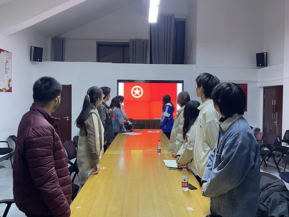 本次入团仪式分三部分展开。仪式进行第一项,全体团员面向国旗唱国歌,团总支委员殷玉娇向各位新团员说明举行入团仪式的重要意义,并宣读新团员名单。随后,由团总支委员为新团员代表颁发团徽,老团员为新成员佩戴团徽,全体团员面向团旗完成庄严的入团宣誓。