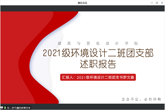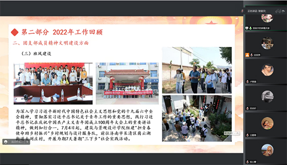 为持续推动基层团组织规范化建设,检验团支部工作成效,按照团委基层团支部述职工作安排,建筑与景观设计学院团总支于12月8日开展线上团支书述职大会,本次会议由团总支书记陈铁主持,各年级辅导员、团总支委员及各班团支部书记参加。