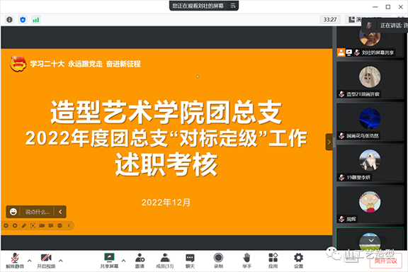 为加强基层团支部组织建设,深入学习贯彻学习党的二十大精神,引导各基层团支部有针对性开展思想引领、学风建设,更好地联系青年、引导青年和服务青年,12月8日,造型艺术学院团总支通过线上线下相结合的形式开展了2022年团支部“对标定级”工作,对各团支部书记进行线上述职考核。本次考核由学院团总支组织委员刘壮主持,团总支书记许威治、团总支委员、各基层团支部书记参加。