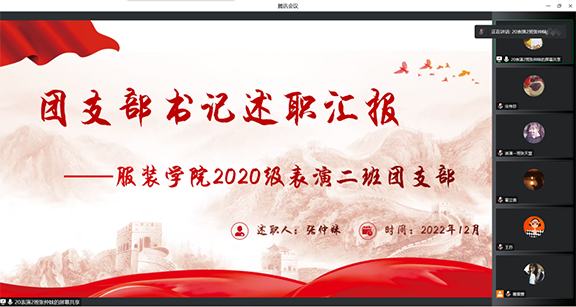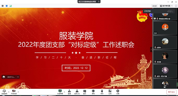 为提升团支部组织力,推进团支部标准化、规范化建设,2022年12月12日,服装学院团总支依托腾讯会议平台,召开2022年度团支部“对标定级”工作会议。本次会议由服装学院团总支书记王苏持,服装学院2019级、2020级、2021级团支部书记参加。