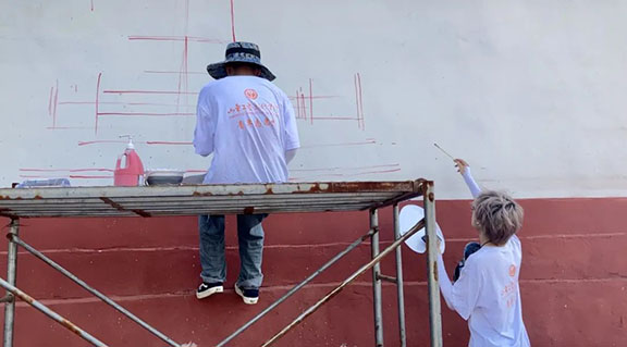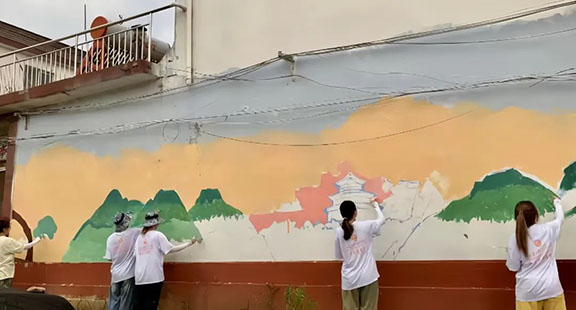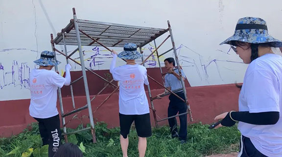 本次实践活动以乡村文化墙绘为主要任务,同时开展驻村入户体验式“四同”教育,旨在同吃、同住、同劳动、同学习中真切感受乡村振兴变化。实践期间,志愿者利用专业特长有条不紊地对墙面进行创作,不论是炎炎夏日抑或是狂风暴雨都从未消弭志愿者们的热情,他们用颜料将社会主义核心价值观与中国大美山河景色相融合,把心中之意化为笔下之文,用手中的画笔为埠口村的墙面增添一份色彩,不仅彰显出新时代乡村文化的时代内涵,形成积极向上、健康文明的道德风尚,更让志愿者们在理论与实践的紧密结合中体悟出劳动的意义。
