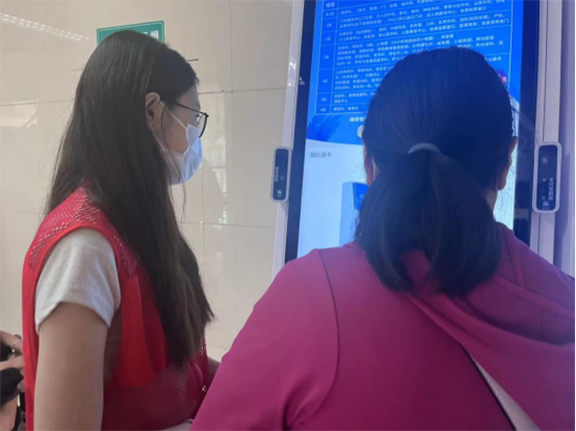 7月5日至7月8日,实践团成员们在山东中医药大学附属医院帮助患者了解就医流程,引导患者到达就诊区域,为门诊患者提供导诊、自助挂号、缴费、自助化验单打印等服务。实践团成员表示“患者对我们说的每一句‘谢谢’,都让我们心中感受到无比温暖”。
